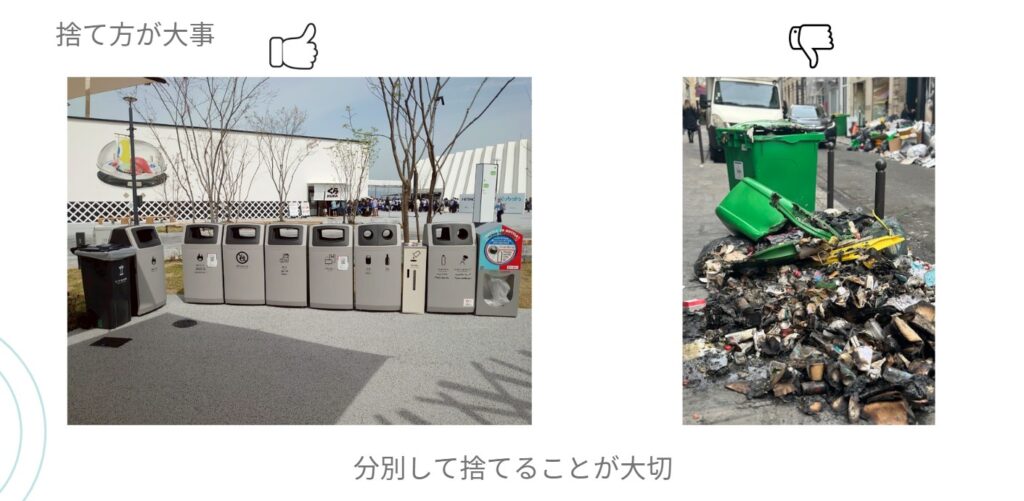 プラスチックはネガティブな捉え方をされているのですが、「プラスチック=悪」なのではなく、捨て方=ポイ捨てが問題であり、扱い方をきちんとしていけばプラスチックは決して悪い素材ではなく、一人ひとりがきちんと分別してゴミ箱に捨てる心掛けが大切であると話しました。