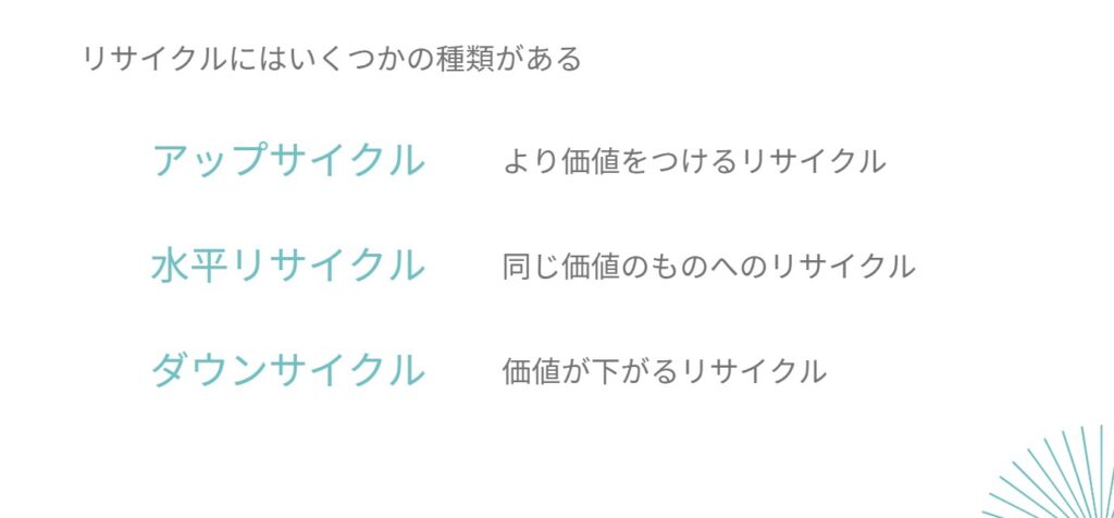 またリサイクルには大きく分けて3つの種類があり、今回はそのうちの一つである「アップサイクル」に焦点を当てた取り組みを行いました。
